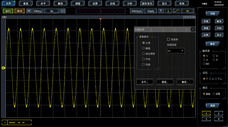 1Gpts的深度存儲器,示波器在慢(màn)時基(jī)檔位下依然保持高的采樣率和快的波形捕獲率。全硬件(jiàn)視窗(chuāng)擴展,可局部放大觀察波形的細節,為您提供波形全局與細(xì)節的同步顯示。