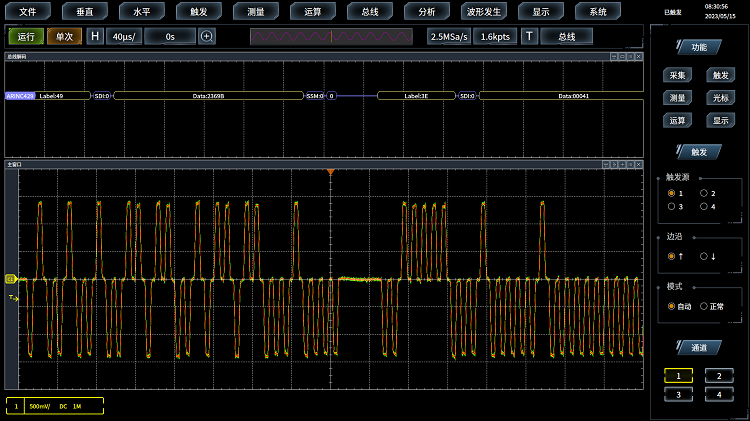4457H係列示波器提供(gòng)一套豐富的觸發功能,含邊沿、邊沿(yán)跳變、雙邊(biān)沿時(shí)間、雙邊沿事件、毛刺、脈寬、矮脈衝、超(chāo)時、碼型、狀態、建立保(bǎo)持(chí)、窗口、區(qū)域觸發(可視觸發)等,為您在紛繁複(fù)雜的采(cǎi)樣信(xìn)息中迅速(sù)鎖定感興趣的事件。