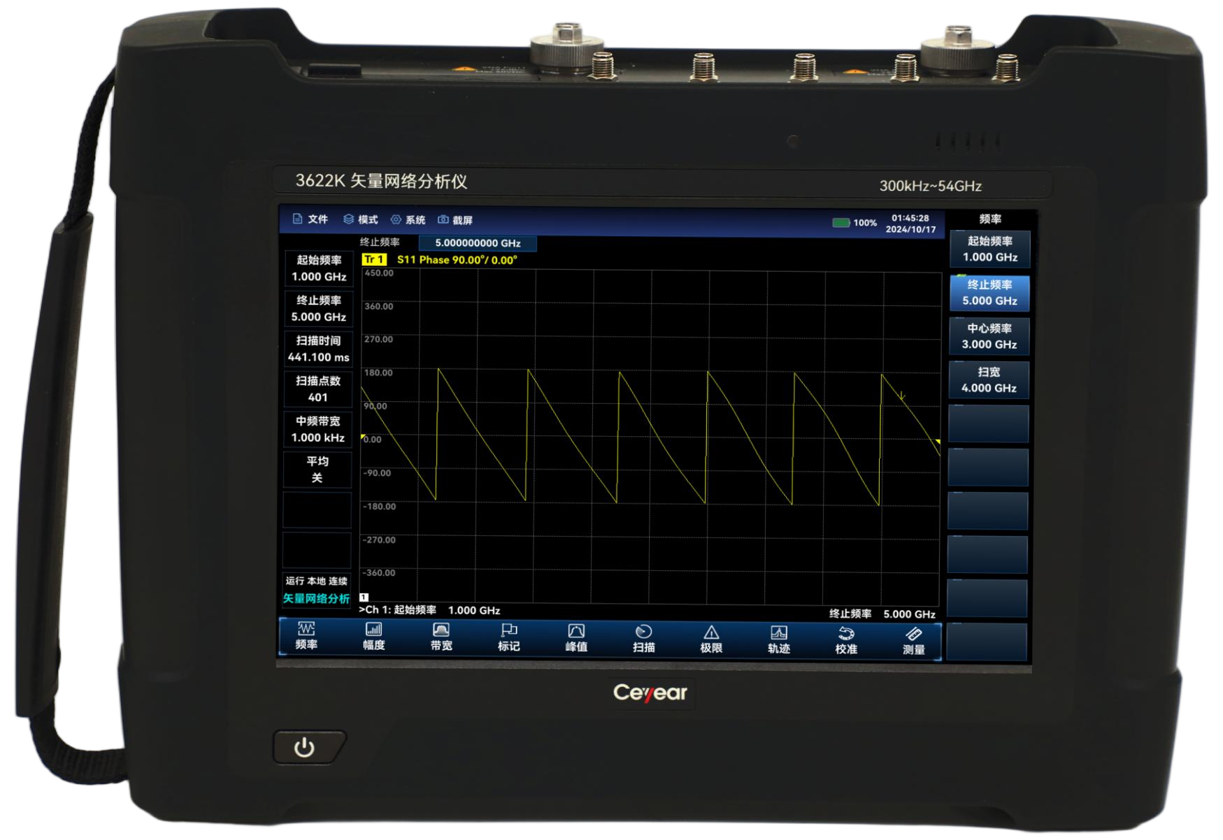 Ceyear 3622 矢量網絡分析儀係列化產 品頻率範圍覆(fù)蓋 300kHz~54GHz,具(jù)有多項測試功能,具有體(tǐ)積(jī)小、 重量輕、環境適應性強、供電(diàn)靈活、操控(kòng) 方便等特點。