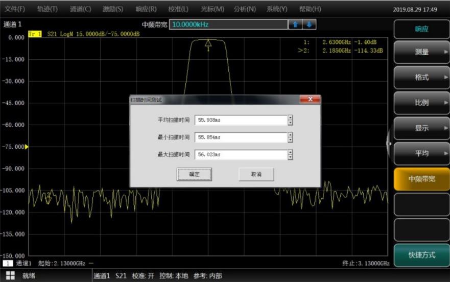 3671係列(liè)矢量網絡分析儀在全頻段201點掃(sǎo)描、600kHz中頻帶寬情況下掃描(miáo)速度可達43ms(典型值),並提(tí)供一鍵式掃描時間測試功能,方便評估。