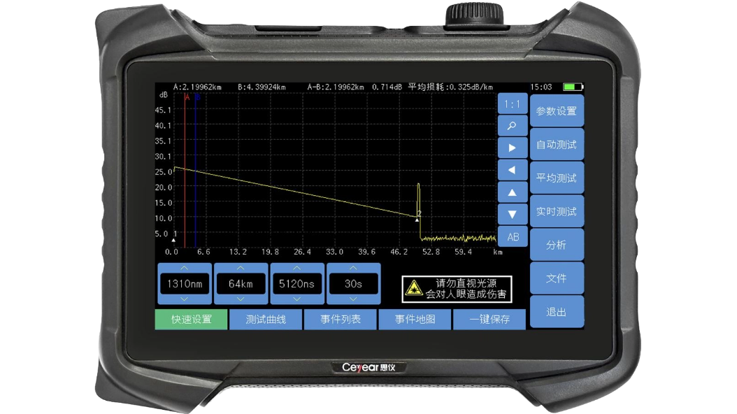 ● 專家OTDR:專業測量(liàng),曲線、列表、MAP同時顯示