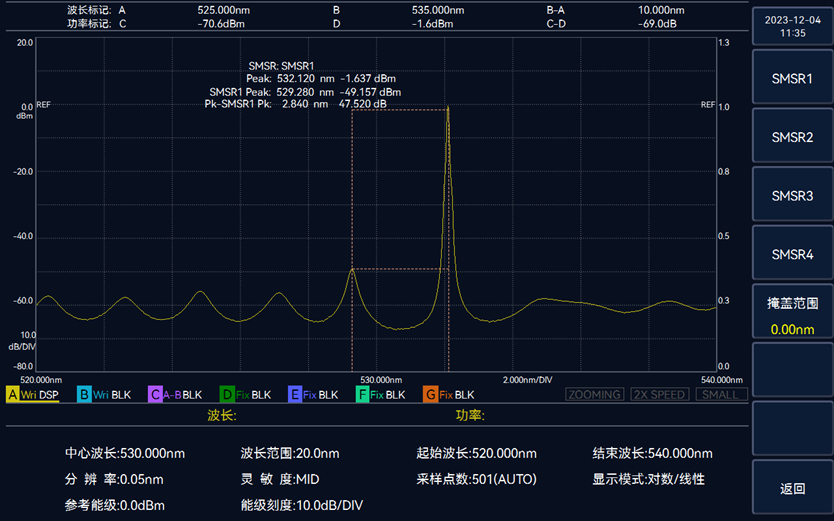 6362C光譜分析儀具備(bèi)多場景光譜分析功能,針對DFB-LD等單縱模激光光源(yuán),儀器提供閾值分(fèn)析和邊模抑製比分(fèn)析兩種分析方法(fǎ),有(yǒu)效準確的評(píng)估單縱模待測光源的中心波長、光譜帶寬和邊模抑製比。