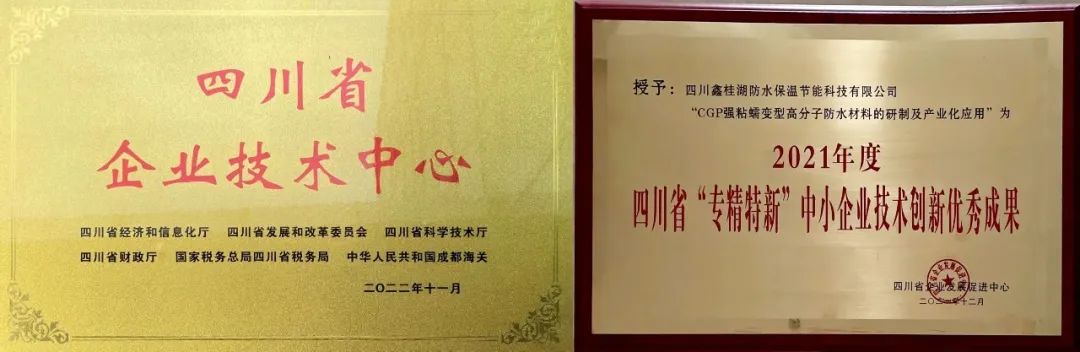 其(qí)中我司自(zì)主研發、生產的差異化產品CGP強(qiáng)粘高分子防水卷材係列(liè),該項經科學技術成果評(píng)價,成(chéng)果水平達到國內領先、同時也獲得四川省“專精特新”中小企業技術創新優秀成果證(zhèng)書(shū)。新(xīn)一(yī)代科技(jì)防水材料產品,具有“強力粘結和蠕變密封”兩(liǎng)大特點,冷施工,耐老化性能優,適用範圍廣,全生命周期低碳環保。
