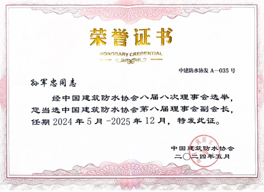 桂湖防水集(jí)團董事長孫軍(jun1)忠(zhōng)先生當選(xuǎn)為(wéi)中(zhōng)國建築防水協會第八屆理事會副會長。