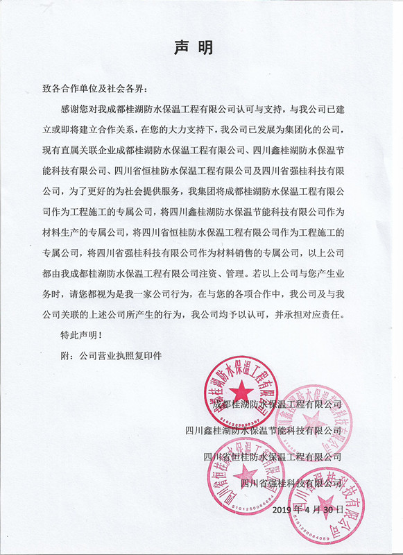 感謝您對我成都桂湖防水保溫工程有限公司認可與支持,與我公司已建立或即將建立合作關係,在(zài)您的大力支持下,我公司已發展為集團化的公(gōng)司,現(xiàn)有直屬關聯企業成都桂湖防水保溫工程有限公司、四川鑫桂湖防水保溫節能科技有限公司、四川省(shěng)恒桂防(fáng)水保溫工程有限公(gōng)司及四川省強(qiáng)桂科技有限(xiàn)公司,為了更好的為社會提供服務,我集團將成都桂湖防水保溫工(gōng)程有限公(gōng)司作為工程施工的專屬公司,將(jiāng)四川鑫桂湖防水保溫節能科技有(yǒu)限公司作為材料生(shēng)產的專屬公司,將(jiāng)四川省(shěng)恒桂防水保(bǎo)溫工程(chéng)有限公司作為工程施工的專屬公司,將四川省強(qiáng)桂科技有限公司作為材料銷售的專屬公司,以上公(gōng)司都由我成都桂湖防水保(bǎo)溫工程有限公司注資(zī)、管理。若以上公司與您產生業務(wù)時(shí),請您都視為是我一家公司行為,在與您的各項合作中,我公司及(jí)與我公司關聯的上述公司所產生的行為,我公司均予以認可(kě),並承擔對應責任。