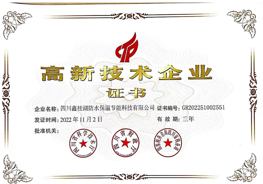 公司以創新型發(fā)展動力,旗下四川鑫(xīn)桂湖防(fáng)水保溫節能科技(jì)有限公司為高(gāo)新技術企業和四川省“專精特新”中小企業,公(gōng)司產品取得“中國綠色建材產品認證(zhèng)證書、十環(huán)認證”等多項認證。其中“CGP強粘蠕變型高分子防(fáng)水卷材(cái)的研製及產業化應用(yòng)”成果經科學技術評價,成(chéng)果水平為國內領先(xiān)。
