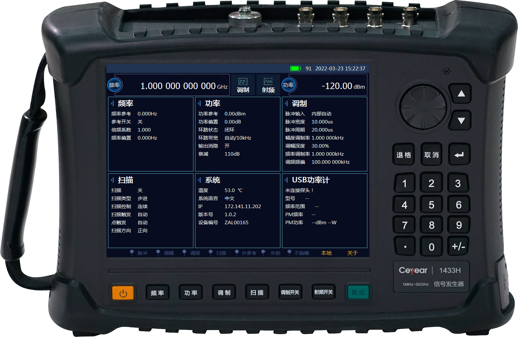 1433係列信號(hào)發生器是中電科8x8x在线免费视频科技股份有(yǒu)限(xiàn)公(gōng)司專為外場(chǎng)測試設計的一款手持式儀器,具有連續(xù)波信號輸出、頻率/幅度/脈(mò)衝多種調製、大動態範圍幅度調(diào)節、步進/列表掃描等功能,采用8.4寸大(dà)屏幕(mù)液晶及電容(róng)觸摸屏一體化設計,方便用戶操作。 1433係(xì)列信號發生器具有(yǒu)體積小巧、供電靈活、環境(jìng)適應性強等特點,非常適(shì)合(hé)現(xiàn)場使用。可應用於電子綜合係統(tǒng)故障診斷、接收機性能測試、通信、導航等設備的外場安裝、調試及日常維護保障(zhàng)工作。