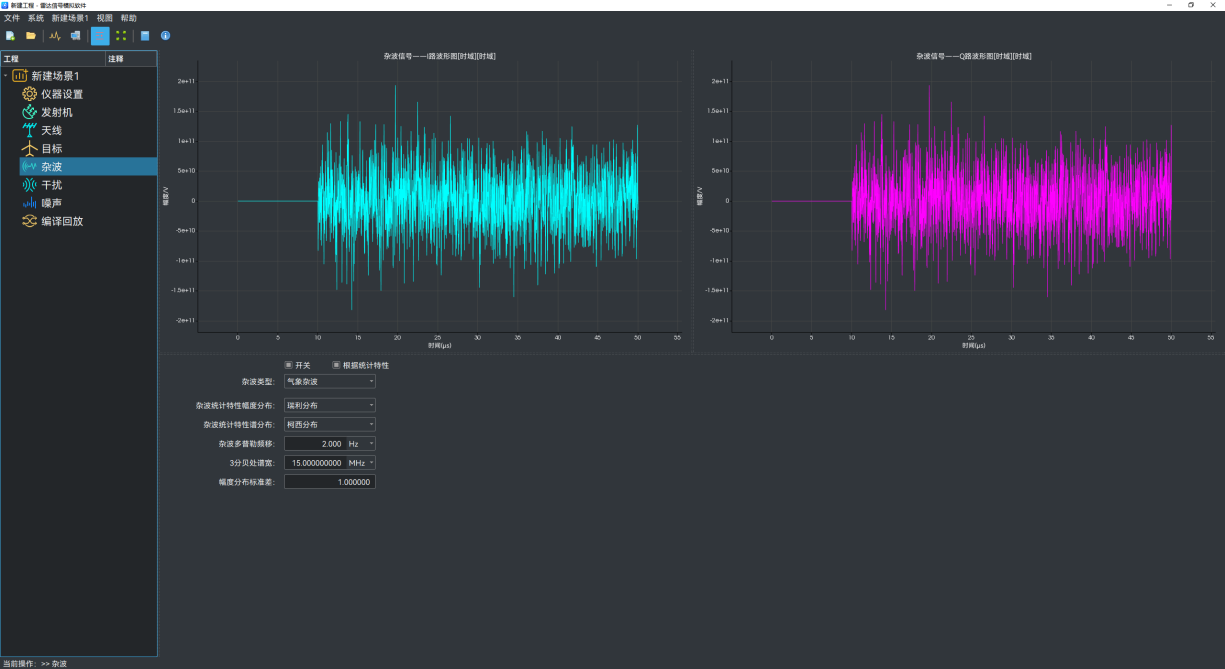 雷達信號模擬軟件可模(mó)擬豐(fēng)富的雷達背景(jǐng)信號,支持雜波、幹擾、噪聲等背景信號模(mó)擬,結合目標信號模擬,為(wéi)驗證雷達複雜背景下目標檢測性能和接收(shōu)通(tōng)道射頻性能提(tí)供了可能。軟件可模擬地雜波、海雜波和氣(qì)象雜波,涵(hán)蓋不(bú)同種類雷達所麵臨的雜波環境。此外,雷達信號模擬軟件可以直(zhí)接通過雜波類型或(huò)雜波統計特性對雜波進行建模仿真。圖為軟(ruǎn)件模擬產生的(de)氣象雜波信號,幅度服從瑞利分布(bù),譜分布為柯西分布。