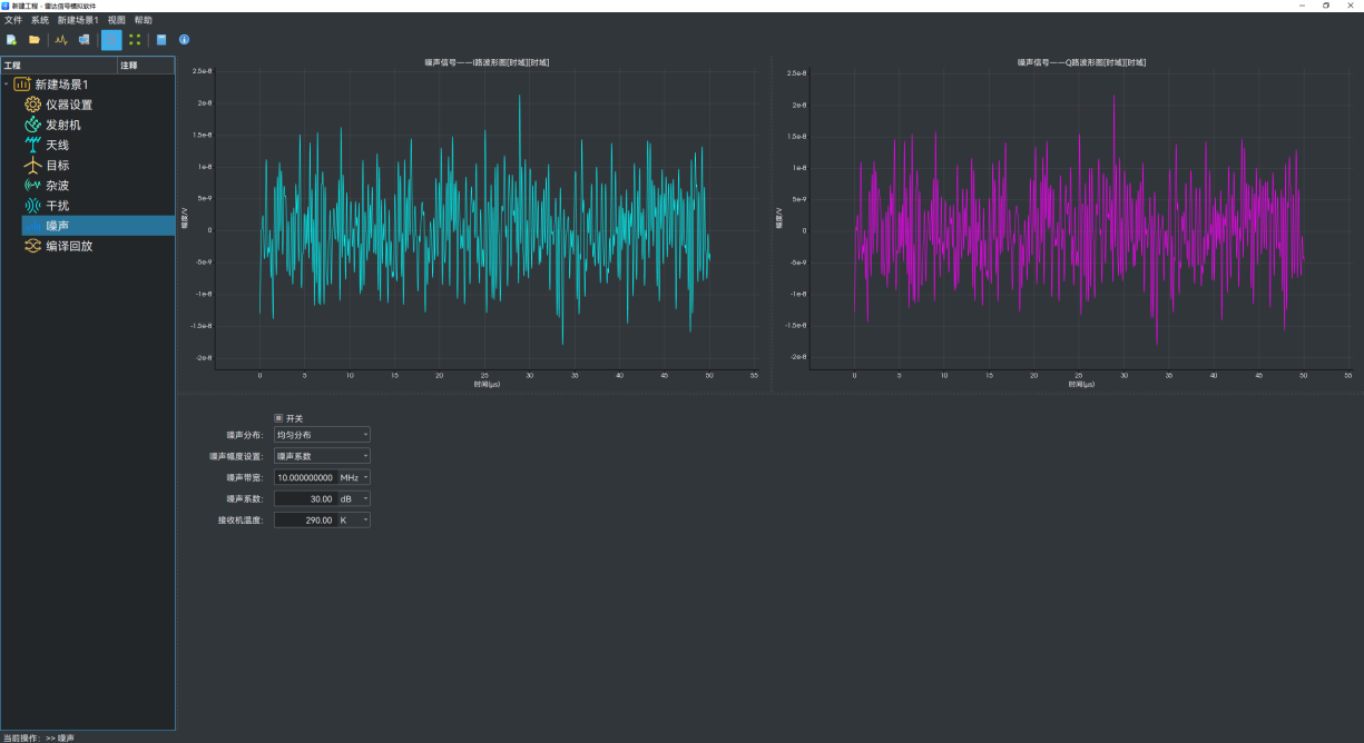 雷達信號模擬軟件可模擬兩類幹擾信號,一類為無源幹擾信號,一類為有源幹(gàn)擾信號。無源幹擾主要指箔條幹擾(rǎo)信(xìn)號,有源(yuán)幹擾信號又分為壓製(zhì)式幹擾信號和欺騙式幹擾信(xìn)號。此外,雷達信號模擬軟件還可模擬產生均勻分布和高(gāo)斯分布兩類噪聲信號,用(yòng)於模擬現實雷達回波信號中的噪聲信號。圖為信號模擬軟件模(mó)擬具有均勻分布的噪聲信(xìn)號。