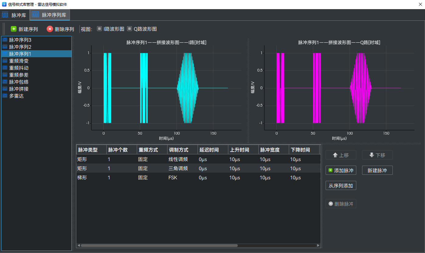 雷達信號模擬軟件內(nèi)置脈衝序列庫功能(néng),用戶可以對脈衝庫中定義的脈衝信號進行拚接建立新的脈衝序列信號。圖為雷達信號模擬軟(ruǎn)件建立的脈衝序列(liè)信號,該序列信號共(gòng)包含3個脈衝信號,分別具有不(bú)同的脈衝包絡和調製樣式(shì)。