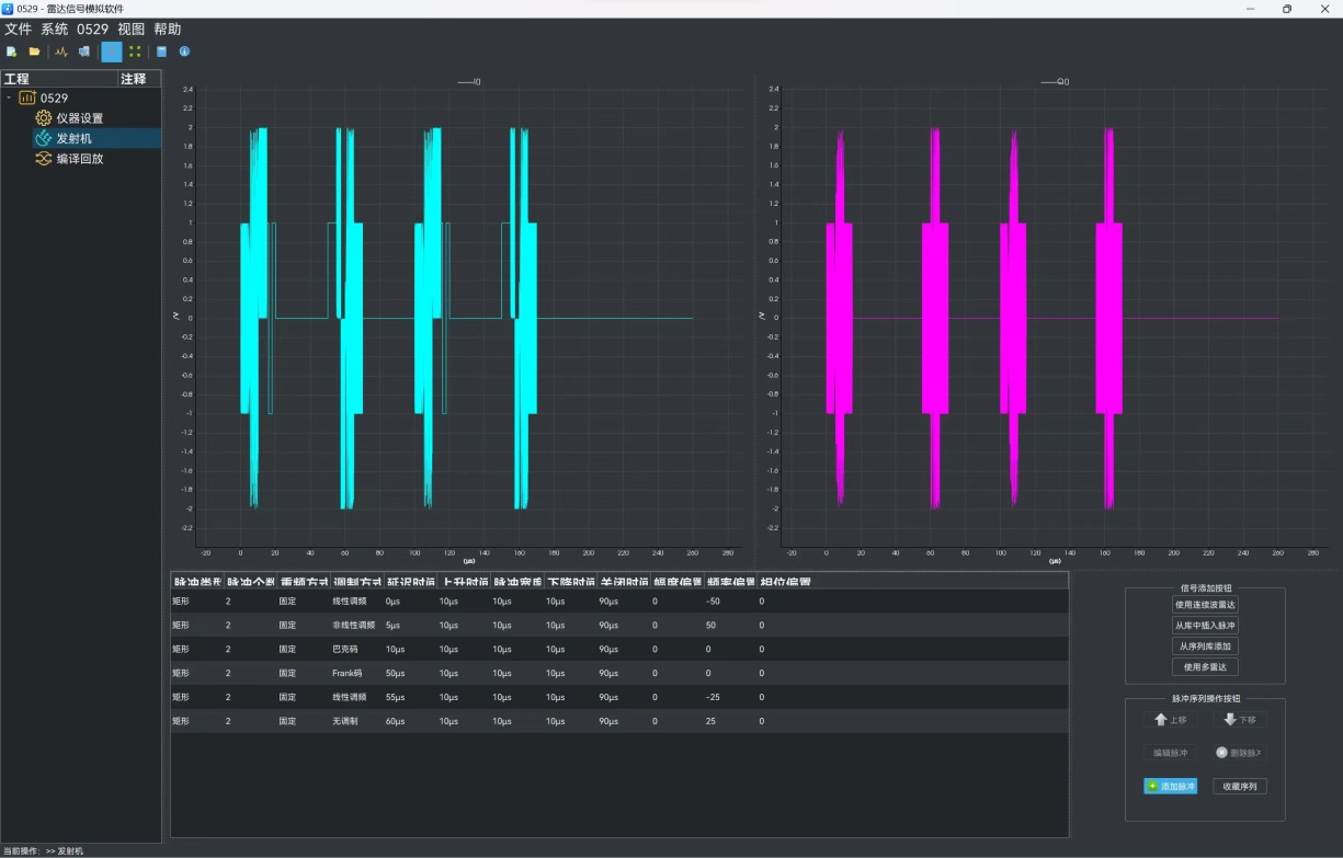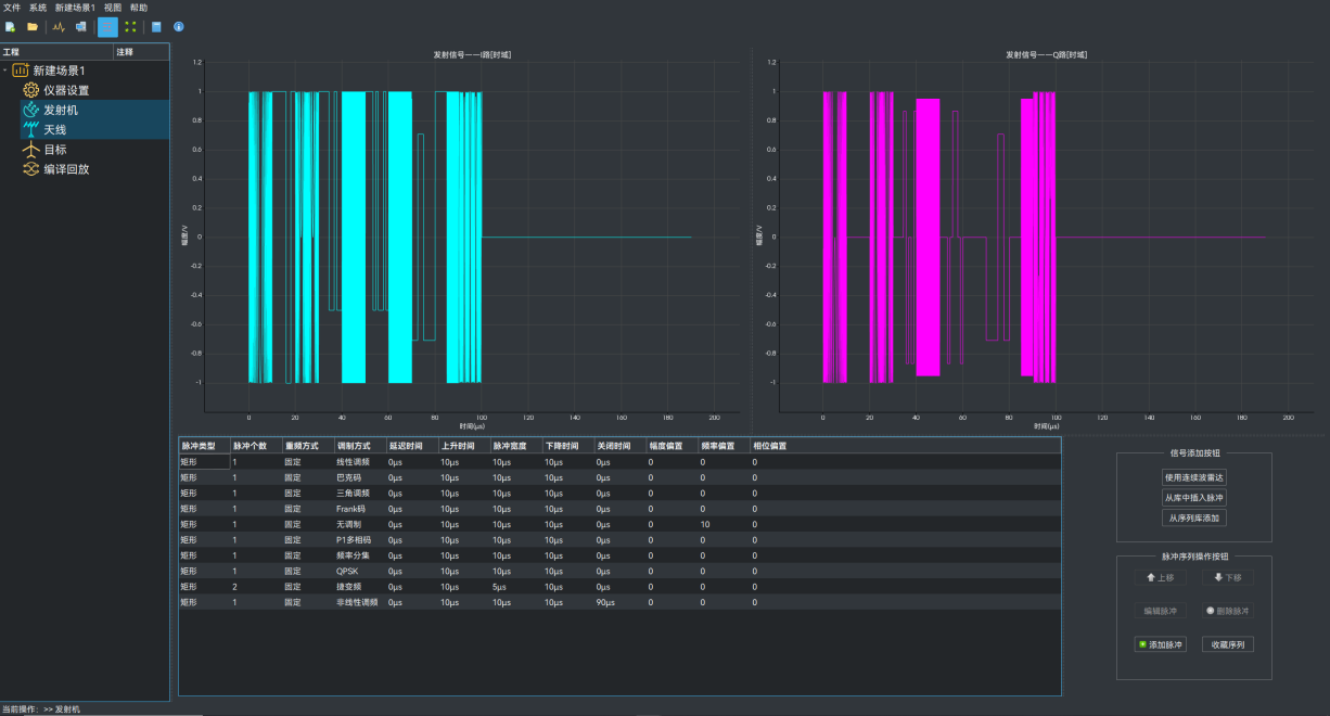 雷達信號模擬軟件支持脈內多(duō)調製及同時到達多脈衝信(xìn)號模擬功能,用戶可以在一個脈衝內添加多(duō)種(zhǒng)調製方式(shì)的雷達信號以及進行多雷達信號同時到達模擬。圖為雷達信號模擬軟件建(jiàn)立的脈內多調製信(xìn)號模擬(nǐ)界麵和多雷達信號同時到達模(mó)擬界麵(miàn),該脈衝信號內部包含多種(zhǒng)雷達信號樣(yàng)式,每種雷達信號具有不同的調製樣式。