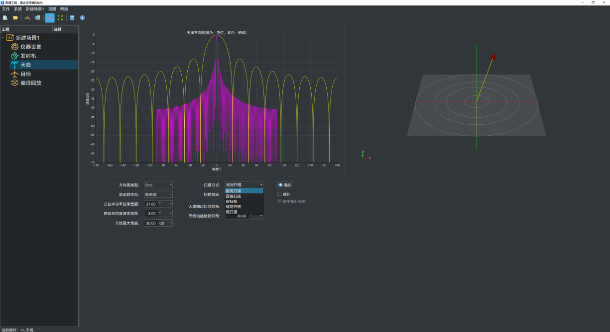 支持(chí)模擬多種天線掃描方式,並可自定義設置(zhì)天線方向圖。