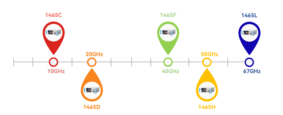 1465C/D/F/H/L頻(pín)率範圍為100kHz~10 GHz /20 GHz /40 GHz /50 GHz /67GHz,5種係列化型號,1465L可輸出頻率最高達70GHz。每種型號都有眾多的選件(jiàn)來進行功能、性能擴展。無(wú)論您需要計量級解決方案,還是基礎型信號發生器,無論您隻需射(shè)頻波段測試信號還是要求信號(hào)頻率高達毫米(mǐ)波,總有一種型號(hào)適合您。