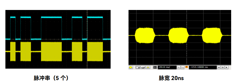 脈衝開關比大於80dB,上升下降(jiàng)時間小於10ns,選用窄脈衝選件H04,最小脈寬20ns,脈寬範圍20ns~42s-10ns,步(bù)進10ns,支持門控、外部等多(duō)種觸發方式,具備測試所需要的脈(mò)衝串(chuàn)功(gōng)能(néng)。