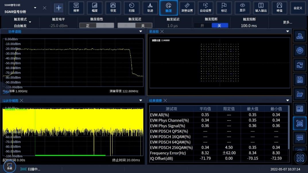 Ceyear 4082係(xì)列信號/頻譜分析儀5G NR測量功能可對3GPP Rel 15和Rel 16版(bǎn)本(běn)的5G NR上行和(hé)下行(háng)信號進行帶內解調分析,支持FDD、TDD兩種雙工模式,支(zhī)持QPSK到256QAM調製(zhì)格式,支持Test Model和自定義參數設(shè)置,支持提供不同信道和信號的誤差矢量幅度(EVM)、頻率誤差和功率等測量結果(guǒ),具(jù)備星座圖、誤差總結表、資源分配等多種顯示圖譜;在帶外測量方麵,4082能提供廣泛的標(biāo)準和限值線一鍵設置能力,高效率執行鄰信道泄漏比(ACLR)、頻譜發射模板(SEM)等(děng)測量。搭配Ceyear專用的協議分析軟件,可對LTE、LTE-Advanced、NB-IoT、WCDMA、GSM、EDGE通信信號進行帶內調製(zhì)分析,提供EVM、星座圖、頻率誤差等多種測量結果。