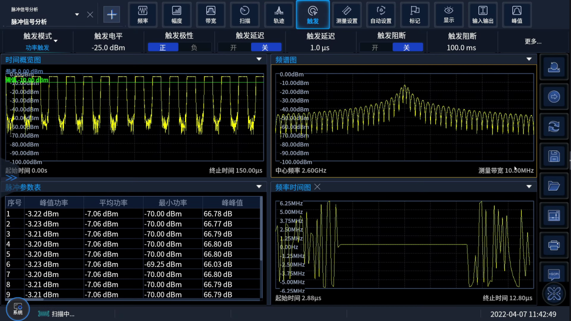 實時頻譜分析功能(néng)是(shì)突發、捷變、跳頻信號等隨時間(jiān)變化信號的(de)極佳測試工具。