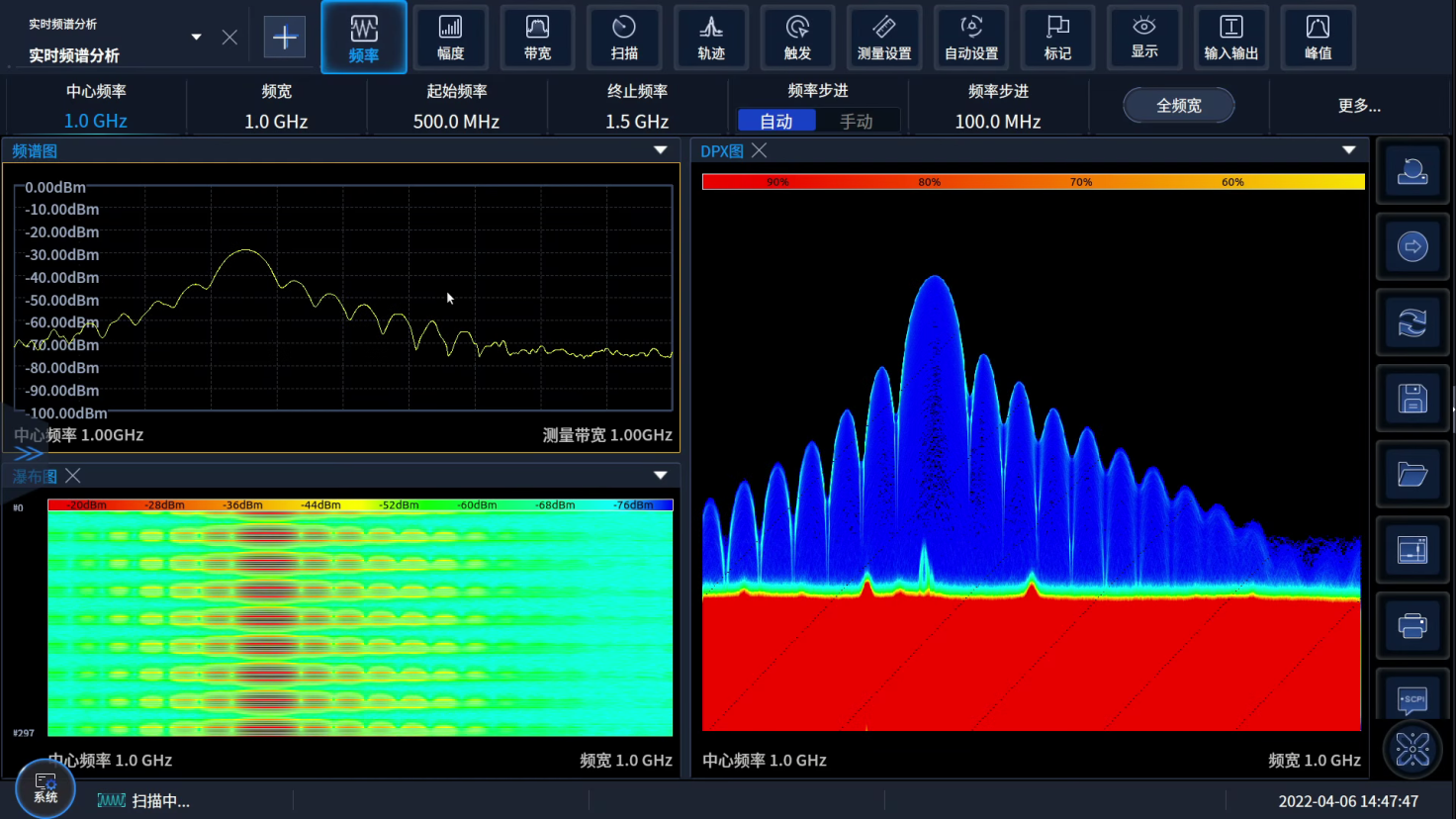 記錄信號帶寬高達1200MHz,具備開始、停止采集功能,具備實時頻譜分析模式實時預覽分析。