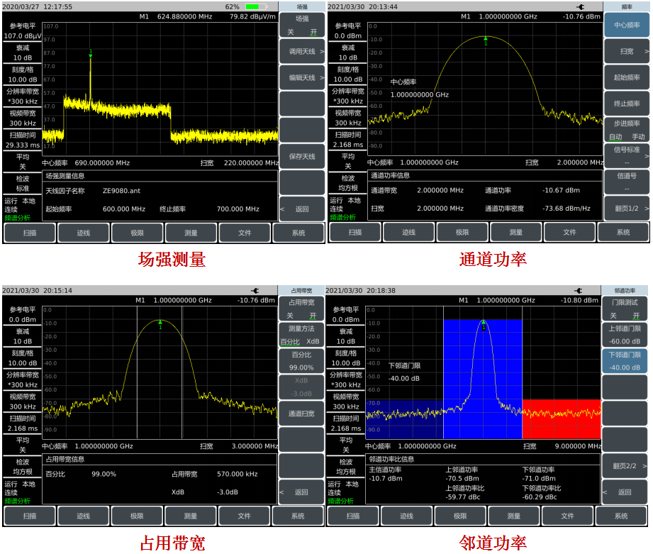 多種智能測量功能:場強(qiáng)測量(liàng)、通道功率、占用帶寬、鄰道功率、音頻解調、諧波失真、頻譜發射模板/雜散(sàn)發(fā)射模板、室內(nèi)/室外地圖測量(liàng)等,支持GPS/北(běi)鬥定位(wèi)及對機內晶振的(de)頻率馴服校準功能