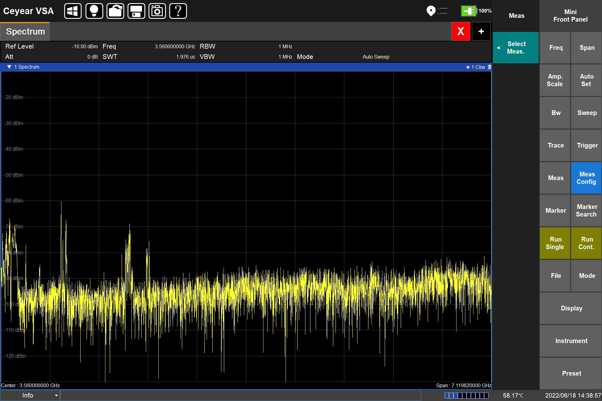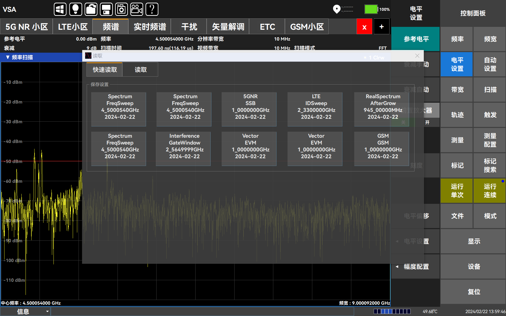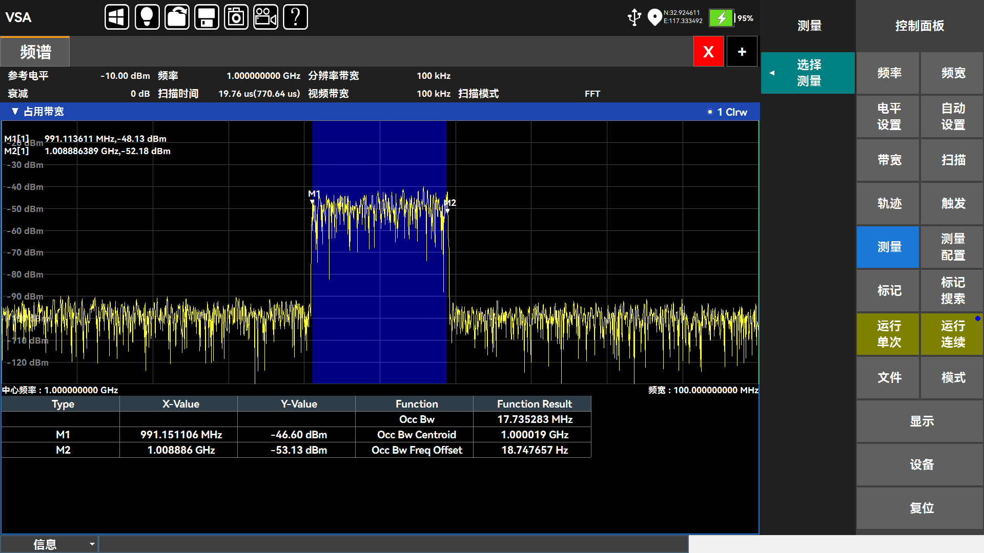測試(shì)分析(xī):頻譜掃(sǎo)描、場強(qiáng)測量、通道功率、占用(yòng)帶寬、鄰道功率(lǜ)、100MHz實時頻譜、場強(qiáng)測量、頻譜發射模板(bǎn)、載噪比、諧(xié)波失真、相位噪聲、音頻解調、矢量分析等(děng)。
